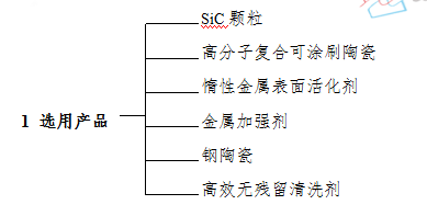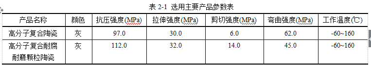 (2)高分子颗粒陶瓷是一种双组份、填充陶瓷小颗粒、高性能表面涂层材料,主要成分是碳化硅、金属碳化物和超硬陶瓷,具有良好的耐磨蚀和腐蚀性能,作为耐磨蚀和耐腐蚀保护涂层被广泛的应用于各种化工设备及通用设备。适合应用于灰浆泵、水泵、风机、水轮机蜗壳、净化烟道、氧化铝粉输送管道等内壁防腐耐磨局部或大面积修复。